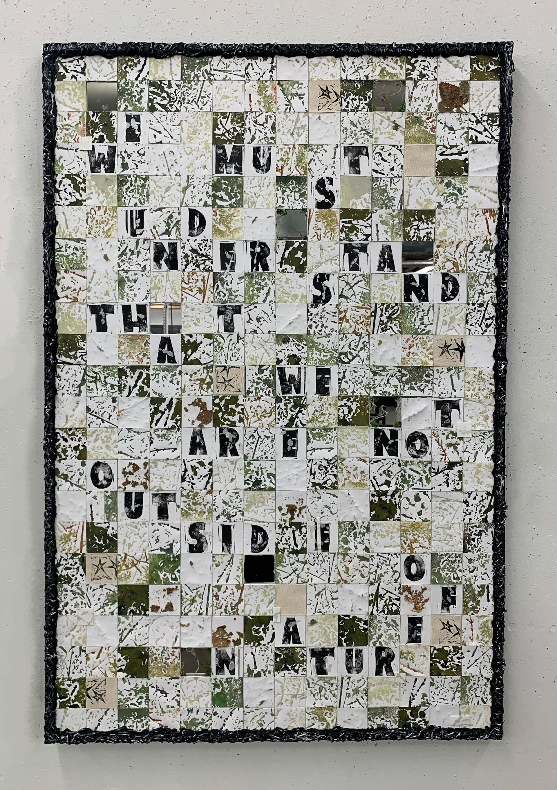 24x36 in, collagraph prints on BFK Rives + linocut + mirrors + natural materials + balsa wood + acrylic on canvas